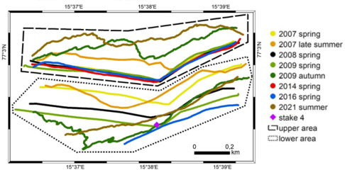 The internal structure of glaciers evolves primarily due to their thermal state, which is influenced by ongoing climate change. Radio-echo sounding is a technique that indirectly identifies water-saturated temperate ice (W-STI) and water-free ice (W-FI) within glaciers. A novel automatic image processing method based on local binarization has been developed to improve the accuracy and efficiency of identifying these layers. Applied to the Arctic glacier Hansbreen from 2007 to 2021, this technique revealed that the glacier’s internal structure evolved from a two-layer system to a nearly homogeneous structure composed mainly of temperate ice (Kachniarz et al. 2025). The dataset contains raw GPR data from 2007 - 2021 taken in the Hansbreen ablation zone used to identify the glacier's internal structure. The profiles are divided into two sections: upper and lower areas. The upper area includes GPR profiles intended to replicate the 2003 GPR profile. The lower area consists of profiles shifted down the glacier, corresponding to the glacier’s movement since 2003. The profile lengths range from 0.7 km to 1.7 km, with the 2016 lower and 2021 upper areas, respectively. In the first season (2007), the GPR profiles were situated at altitudes between 188 and 216 meters above sea level, running transversely to the glacier’s movement. The glacier’s internal structure was examined using GPR system with unshielded 25 MHz, Rough Terrain Antenna (RTA) 30 MHz, and RTA 50 MHz antennas. Image processing Python script based on local binarization and processed image examples have been included in the dataset. See details in Kachniarz et al. 2025. The field data collection and/or processing received grant aid from: Svalbard Integrated Arctic Earth Observing System (SIOS) (SnowInOpt: SIOS Infrastructure Optimisation of the Cal/Val process for the snow research), European Commission Horizon Europe HORIZON-CL5-2024-D1-01-02 (LIQUIDICE: LinkIng and QUantifying the Impacts of climate change on inlanD ICE, snow cover, and permafrost on water resources and society in vulnerable regions) 101184962, the National Centre for Research and Development within the Polish-Norwegian Research Cooperation Programme (AWAKE2 project Pol Nor/198675/17/2013), Polish-Norwegian funding (AWAKE project PNRF-22-AI-1/07), Polish Ministry of Science and Higher Education (GLACIODYN No. IPY/269/2006), PolishNational Centre for Research and Development (SvalGlac project No. NCBiR/PolarCLIMATE-2009/2-2/2010), European Union 7th Framework Programme (ice2sea programme, grant no. 226375. Glaciological data were processed under assessment of the University of Silesia data repository within project Integrated Arctic Observing System (INTAROS, European Union’s Horizon 2020 Research and Innovation Programme—grant No. 727890). The work was supported by the Centre for Polar Studies (the Leading National Research Centre in Earth Sciences for 2014–2018) funding, No. 03/KNOW2/2014. Reference: Kachniarz K., Grabiec M., Wróbel K., Ignatiuk D. 2025: Glacier internal structure revealed by automatic image processing-powered classification of radar images. Applied Geomatics (in review)